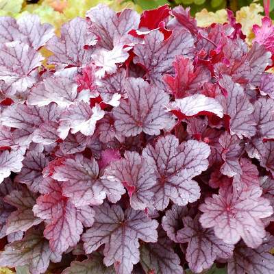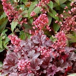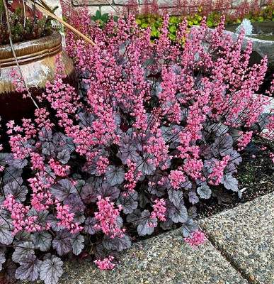 Гейхера Milan (Милан). Листья небольшие, серебристые с бордовыми прожилками. Обратная сторона листа темно-красная. Ближе к осени на листьях появляется бордовый румянец. Высота куста около 30 см, диаметр до 50 см. Цветки насыщенно-розовой окраски собраны в метельчатые соцветия на коротких стебельках. Цветение красивое и обильное.
