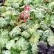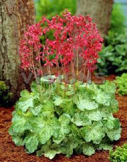 Гейхера кроваво-красная Monet (Монэ). Оригинальная пятнистая зелено-белая листва. Цветки ярко-красные, красиво контрастируют с цветом листьев. Хорошо растет на солнце.