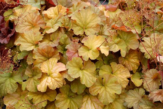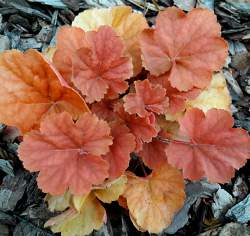 Гейхера Northern Exposure Amber (Нозерн Экспоуже Эмбер). Высота 25-45 см, ширина 45 см. Округлая янтарная листва круглый сезон. Весной и осенью — ярко-оранжевая. Образует плотную розетку. Отличная устойчивость к ржавчине.