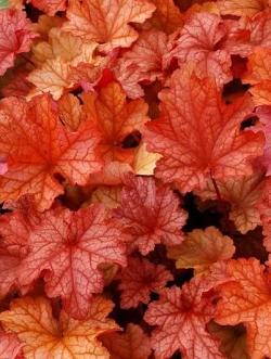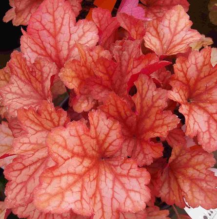 Гейхера Paprika (Паприка). Крупные волнистые листья. Цвет изменяется по мере развития листовых пластинок. Вначале они ярко-лососевые, а со временем приобретают теплый пылающий вишнево-коралловый или даже винный оттенок. Особую пикантность растению придает контрастное основному фону светлое, почти белое жилкование. Цветки белые. Высота растения 20 см., диаметр 40 см, цветоносы около 30 см высотой. Гейхера с быстрым темпом роста. Цветет в мае-июне.