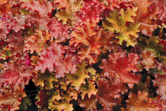 Гейхера Peach Crisp (Пич Крисп). Высота 30-35 см. Сорт с яркими, сильно гофрированными и немного вытянутыми листьями, которые меняют окраску в течение сезона от янтарно-желтого до персикового и красного.