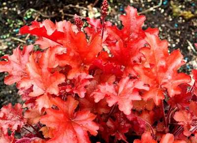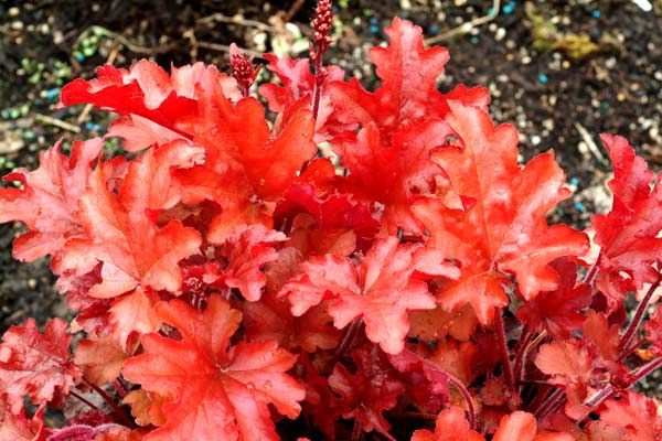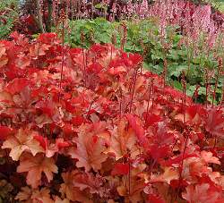 Гейхера Peach Flambe (Пич Фламбэ). Компактный кустик с листьями, изменяющими окраску от красно-оранжевого весной до персикового летом и цвета сливы осенью!