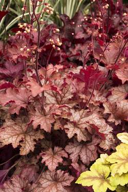 Гейхера Peach Parfait (Пич Парфэ). Куст высотой 30 см и диаметром 40 см. Листва красивая, в персиково-розовых тонах. В более холодное время покрывается серебряным рисунком. Этот сорт предпочитает расти в тени.