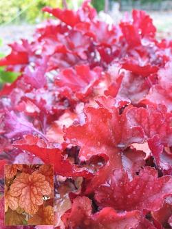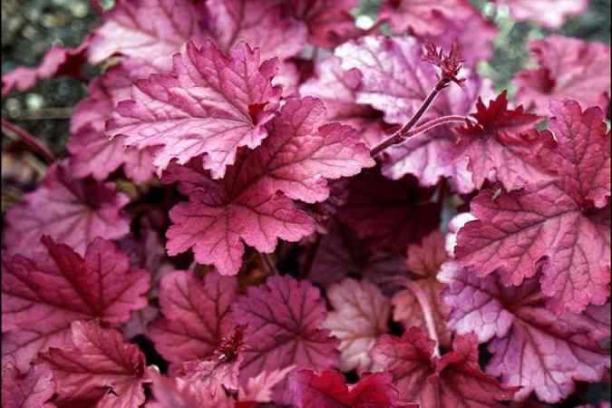 Гейхера Penelope (Пенелопа). Высота 15 см, с соцветиями 30 см, ширина куста 40 см. Прекрасная нежная окраска листьев — розоватая с карамельными и абрикосовыми тонами. Цветки мелкие, белые. Цветение: май-июнь.