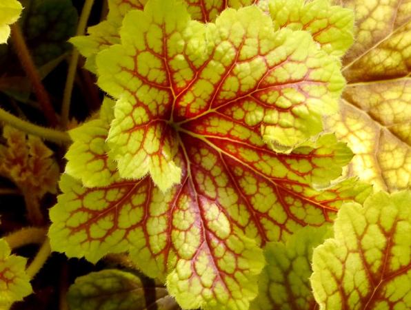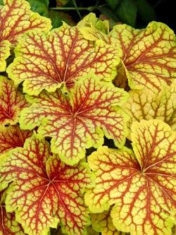 Гейхера Red Lightning (Ред Лайтнинг). Огромные ярко-желтые листья пронизаны ярко-красными прожилками, похожими на разряды молнии. Цвет держит хорошо на протяжении всего сезона. Цветки белого цвета. Предпочитает полутень и питательные, хорошо дренированные почвы без застоя влаги.