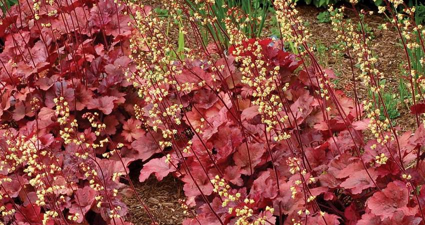Гейхера Root Beer (Рут Бир). Листья резные, медно-красные. Цветки желтоватые, собраны в пушистые соцветия. Очень эффектно смотрятся на фоне листьев. Высота куста около 30 см, диаметр до 35 см. Цветет с мая по июнь.