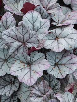 Гейхера Rose Quartz (Роуз Кварц) — Листья пурпурные, покрыты сплошным серебристым рисунком. Такой необычный цвет подчеркивают сильно выраженные ярко-сиреневые жилки. Цветки в начале сезона розовые, а к середине лета становятся нежно-кремовыми, придавая гейхере еще большее обаяние.