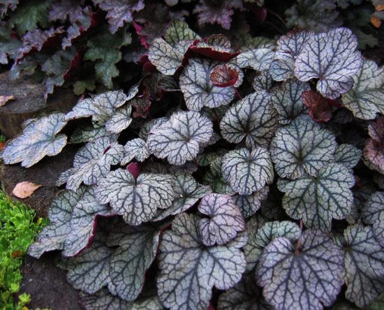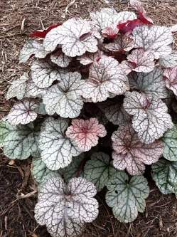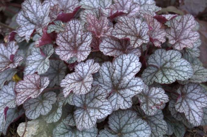 Гейхера Silver Scrolls (Сильвер Скроллс). Считается самым сильным, выносливым и неприхотливым сортом из серии гейхер с яркой серебристой листвой. Эта гейхера стойко переносит непогоду и настолько зимостойка, что начинает расти чуть только оттает снег ранней весной.