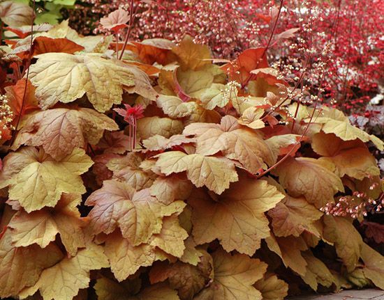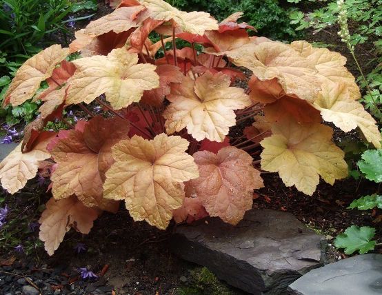 Гейхера Southern Comfort (Саусерн Камфэт). Крупная листва с возрастом изменяет оттенок от корично-персикового и светло-медного до янтарного. Кремовые цветки.