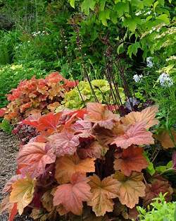 Гейхера Southern Comfort (Саусерн Камфэт). Крупная листва с возрастом изменяет оттенок от корично-персикового и светло-медного до янтарного. Кремовые цветки.