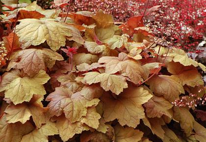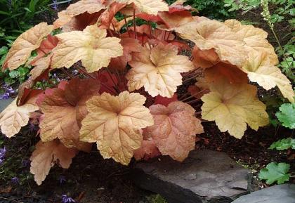 Гейхера Southern Comfort (Сазерн Комфорт). Крупная листва с возрастом изменяет оттенок от корично-персикового и светло-медного до янтарного. Кремовые цветки.