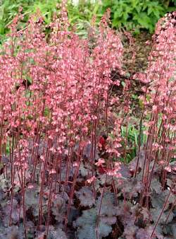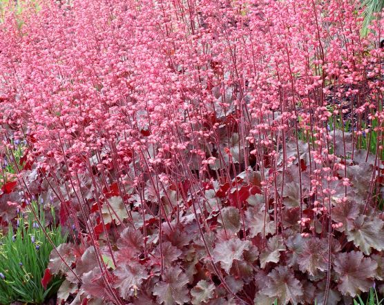 Гейхера Vesuvius (Везувиус). Листья бархатные, темно-бордовые с сизым отливом. Розетка около 35 см в высоту и до 50 см в диаметре. Цветоносы очень высокие, выше, чем у большинства сортов — до 80 см. Цветки ярко-розовые. Похожи на яркий фонтан.