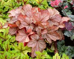 Гейхера Vienna (Виена). Яркий миниатюрный сорт гейхеры. Листья оранжево-желые, с розовым налетом и темно розовыми прожилками. Высота растения 15-18 см, диаметр 35-40 см. Цветки розовые. Предпочитает тенистые места и плодородные почвы.