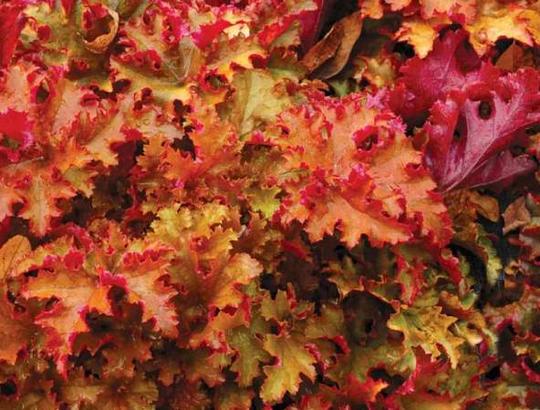Гейхера Zipper (Зиппер). Сорт с очень сильно рифлеными, крупными, плотными листьями, которые играют всеми оттенками теплых тонов. Всегда видна ярко-розовая обратная сторона листа. Хорошая устойчивость к холоду. Цветки кремово белые, появляются в середине лета.