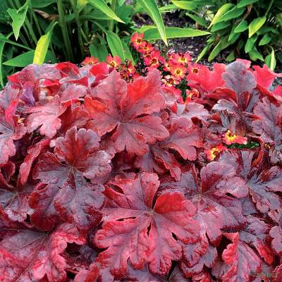 Гейхерелла Buttered Rum (Баттэд Рам). Яркая выразительная плотная розетка листьев любит менять наряды. Летом она карамельно-оранжевая, а к осени от розово-красной до почти бордовой. Маленькие белые цветки появляются в конце весны. Хорошо переносит жаркий и влажный климат. Высота 15-20 см. Ширина 35 см. Цветет май-июль. Зона зимостойкости: 4 (-35 °С).