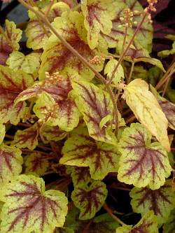 Гейхерелла Gold Cascade (Голд Каскад). Листья небольшие, округлые, золотистые с бордово красным центром вокруг центральных жилок. Цветки светло-коралловые. Высот 20 см.