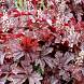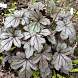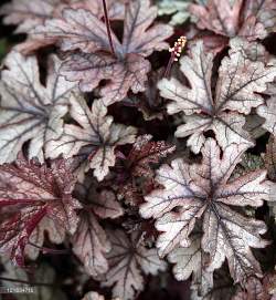 Гейхерелла Gunsmoke (Гансмоук). Листья в форме кленовых: молодые фиолетово-красных тонов, зрелые серебристые с тёмными прожилками. Белые цветы в начале лета. Гибрид с участием гейхеры волосистой (H. villosa).