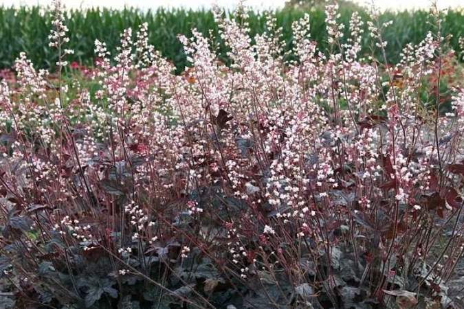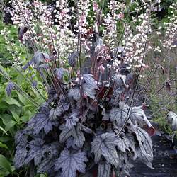 Гейхерелла Infinity (Инфинити). Листва яркая шоколадно-фиолетовая с серебристым узором. Цветение продолжительное и эффектное, с мая по июль над подушкой темной листвы возвышаются пышные облака нежно-розовых соцветий.