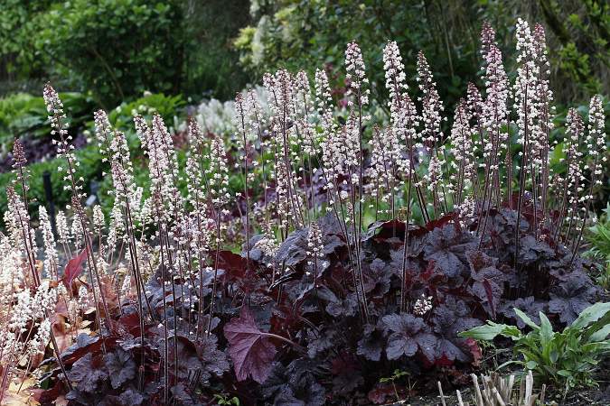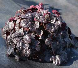 Гейхерелла Onyx (Оникс). Листья резные, глянцевые, плотные, курчавые. Окраска пурпурная, почти черная. Цветки розовые. Диаметр куста 30 см, высота 25 см. В цвету достигает 40 см.