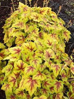 Гейхерелла Stoplight (Стоплайт). Очень выразительная гейхерелла с ярко-желтой матовой листвой с красной серединой и прожилками, цветки белые.