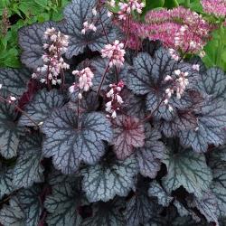 Гейхерелла Twilight (Твайлайт). Сорт отличают красивые бархатистые листья пепельного цвета с серебристым напылением. Прожилки темные, создают красивый рисунок. Соцветия белые, красиво смотрятся на фоне темных листьев. Высота до 25 см, диаметр 60 см.