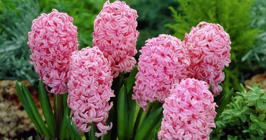 Гиацинт безусловный лидер среди растений, пригодных для выгонки. Его плотные, с сильным ароматом соцветия из звездчатых цветков сидят на безлистных цветоносах. У гиацинта много достоинств при выращивании в открытом грунте: он компактен, его цветки долго не увядают, имеют разнообразнейшую окраску и приятно пахнут. Местоположение лучше солнечное или слегка затененное место. Любая садовая почва с большим содержанием гумуса. Высаживают в сентябре-октябре на глубину 15 см на расстоянии 20 см.