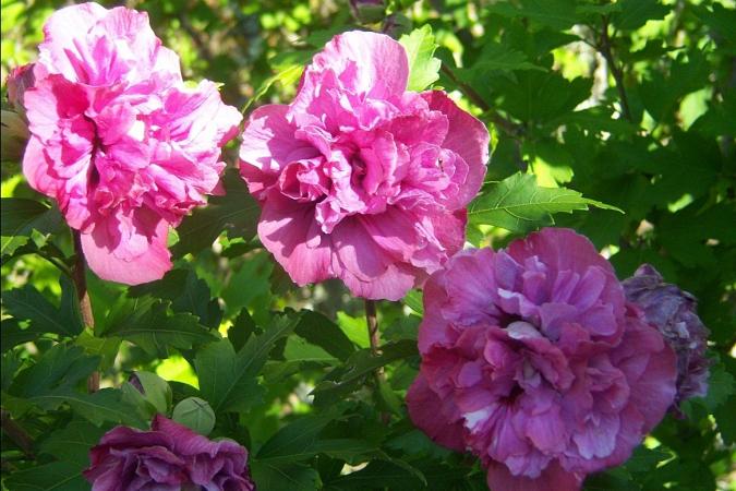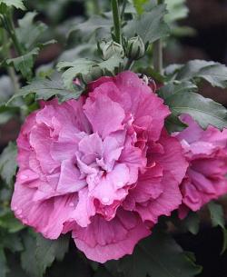 Гибискус Duc de Brabant (Дюк де Брабант). Многолетний древовидный лиственный кустарник с пышной кроной. Кусты с махровыми сиреневыми цветами вырастают до 200 сантиметров. Декоративны не только соцветия, но и узкие темно-зеленые листья оригинальной формы. Цветет с июля до наступления осенних заморозков. Плодоносит коричневыми коробочками с пятью стенками.