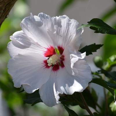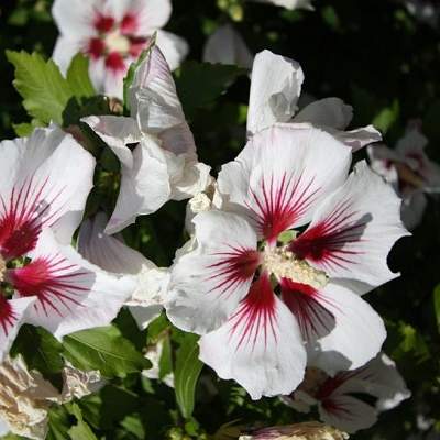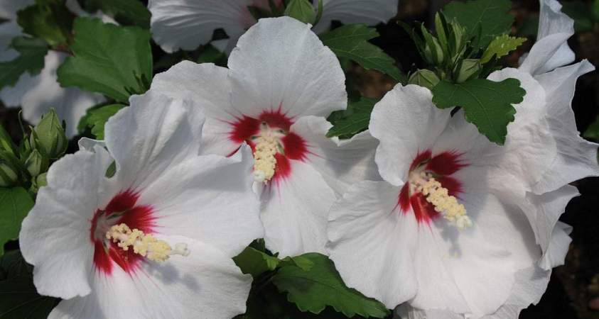 Гибискус сирийский Red Heart (Ред Харт). Чудесная свежая окраска. Цветки крупные, около 13 см в диаметре, белоснежные с ярким карминовым глазом. Предпочитает богатые гумусные почвы со слабокислой или слабощелочной реакцией.