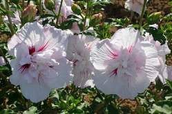 Гибискус сирийский China Chiffon (Чайна Шифон). Листопадный кустарник высотой до 5 м. Отличается ярко-зелеными яйцевидными листьями до 10 см длиной. Выращивают в виде кустиков или небольших штамбовых деревцев. Гибискус любит много света, тепла и влаги. Тогда он долго и пышно цветёт со второй половины лета и до заморозков. Может мириться и с полутенью, но тогда цветёт хуже.