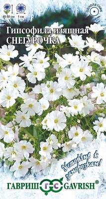 Гипсофила изящная Снегурочка. Неприхотливое растение семейства Гвоздичные с тонкими сильноветвящимися побегами высотой 40-50 см, образующими ажурный кустик. Цветет очень обильно в июне-июле, около трех недель. Для получения цветущих растений в течение всего лета посев можно проводить в несколько сроков с интервалом 1,5-2 недели (гипсофила зацветает через 1,5 месяца после посева). Снежно-белые цветки диаметром до 1 см собраны в рыхлые широкие соцветия. Холодостойка, светолюбива и достаточно засухоустойчива, предпочитает легкие некислые почвы. Выращивают прямым посевом в грунт в начале мая или под зиму. Всходы появляются через 8-10 дней после посева, их прореживают с расстоянием между растениями 15 см. Используется для посадки в миксбордерах, альпинариях, бордюрах и рабатках и получения срезки (для аранжировки букетов).