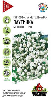 Гипсофила метельч. Паутинка. Неприхотливое многолетнее растение семейства Гвоздичные. Представляет собой сильно ветвистый, ажурный, почти шаровидный куст до 1 м в диаметре и до 1 м высотой, с мелкими многочисленными махровыми цветками белого цвета. Цветет в июне — августе. На одном месте может расти до 25 лет. Предпочитает легкие, сухие, водопроницаемые, удобренные почвы. Выращивают рассадным способом или прямым посевом в открытый грунт. Эффектны в одиночных и групповых посадках, в срезке с другими цветами, в аранжировке сухих букетов.