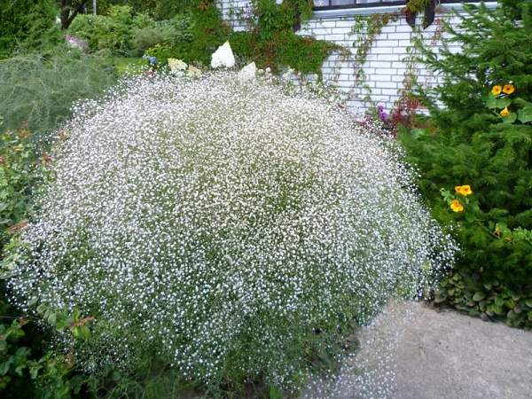 Гипсофила метельчатая. Цветки мелкие, собраны в метельчатые соцветия. Стебли узловатые, сильно ветвистые, особенно в верхней части, образуют ажурный куст шаровидной формы. Листья мелкие, узкие, прикорневые — ланцетные или линейно-ланцетные, опушенные. Все растение серовато-зеленое.