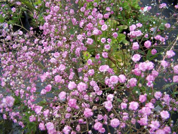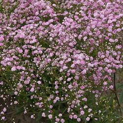 Гипсофила метельчатая Pink (Пинк). Цветки махровые, розовые. Стебли узловатые, сильно ветвистые, особенно в верхней части, образуют ажурный куст шаровидной формы. Листья мелкие, узкие, прикорневые — ланцетные или линейно-ланцетные, опушенные. Все растение серовато-зеленое.