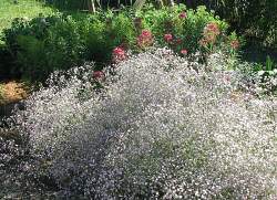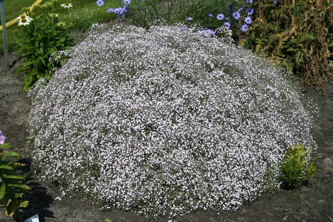 Гипсофила метельчатая Rosenschleier (Розеншлейер). Межвидовой гибрид гипсофилы метельчатой и гипсофилы ползучей. Многолетнее растение, образующее компактные, густо ветвистые кусты или дерновины до 100 см в поперечнике. Цветет дольше других сортов, мелкими махровыми цветками, меняющими оттенок с белого в начале цветения до ярко розового при отцветании.