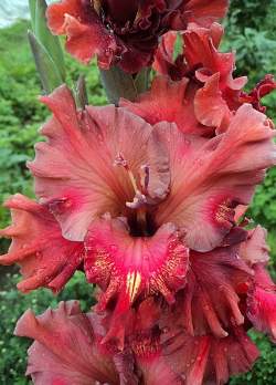 Гладиолус Агатовые Бусы. 597-CР-08. Красно-коричневый с золотинкой на нижнем лепестке. Шикарная гофрировка. Высота цветоноса 150 см, соцветия — 80 см. Количество бутонов в колосе 22, одновременно раскрыты 10.