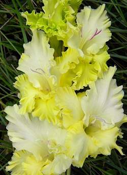 Гладиолус Ажурная Вязь. Жёлтый с усилением окраски к краям. Цветки размером 11,5-14 см. Гофрировка сильная, зубчатая. В соцветии может быть 12 одновременно открытых цветков из 22. Цветонос высотой 160 см. Срок цветения средне-ранний.