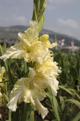 Гладиолус Белый и Пушистый. 410, с, Фотин. Кремовый с зеленоватой каемкой на внутренних лепестках, по краям лепестков сильная гофрировка. Высота 125 см. Кремовый с зеленоватой каёмкой на внутренних лепестках. Цветки размером 12 см. Гофрировка очень сильная. В соцветии может быть 7 одновременно открытых цветков из 23. Срок цветения средний.
