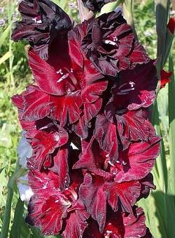 Гладиолус Блэк Стоун (Черный Камень). Очень чистой черно-красной окраски с чуть более светлым горлом, гофрирован крупными волнистыми складками-защипами. Размер цветка 11,5-14 см. Лепестки плотные, прочные, устойчивые к солнцу и дождю. Соцветие длинное ровное. В соцветии 26 бутонов, одновременно открытыми держит до 10 цветков. Высота 160 см. Хорош для срезки. Срок цветения от средне-раннего до среднего.
