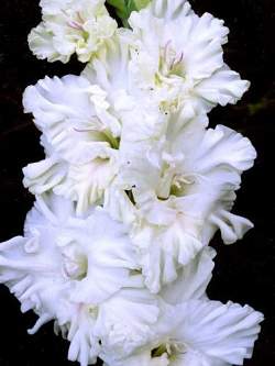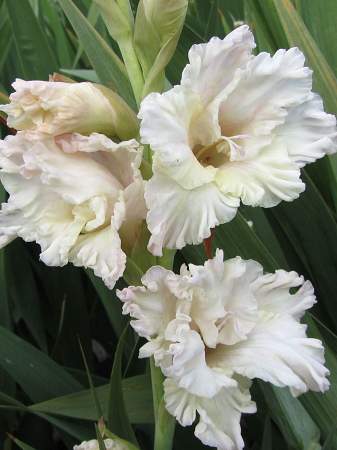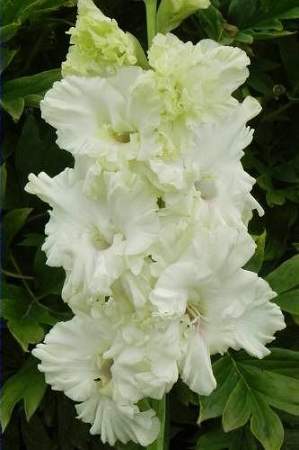 Гладиолус Босиком по Снегу. Прекрасный представитель белых гладиолусов. Крупноцветковый гофрированный сорт. Цветок белый с мягкими волнистыми лепестками. Он похож на утренний снег. Отлично зарекомендовал себя у садоводов. Цветки диаметром 11,5-14 см. Фактура лепестков плотная. В соцветии может быть 9 одновременно открытых цветков из 21. Цветонос высотой 140 см. Срок цветения средний. Очень хорош при флористическом оформлении помещений