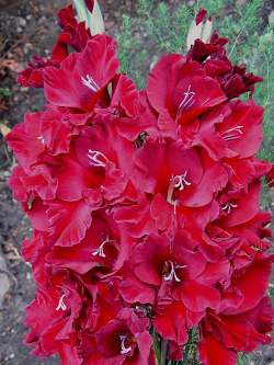 Гладиолус Центаурус. Тёмно-вишнёвый с белой стрелкой. Цветки размером более 14 см, гофрированные. Срок цветения средне-поздний. Стройный высокий гладиолус. Данный гладиолус шедевр чешской секции. Мощный, бархатный с крупными цветами, плотной укладкой колоса.