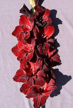 Гладиолус Чёрный Атом, 558. Высота 140 см, 21 бутон (одновременно открыты 7). Чёрно-бордовый. Края лепестков подчёркивает яркая белая кайма. Фактура лепестка плотная, бархатистая, искрящаяся на солнце.