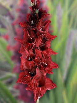 Гладиолус Червоный Кроуль. Высота 150 см. Соцветие 75 см, 23 бутона (одновременно открыты 9). Бутон 13-13,5 см. Очень темный почти чёрно-вишнёвый, со слегка шоколадным отливом и с оторочкой по кромке чёрной каймой. Бархатистость ткани лепестков бросается в глаза. Красивое соцветие с плотной укладкой и жёстким стеблем. Ткань плотная, прочная, устойчивая к солнцу и непогоде. Гофрировка умеренная. Срок цветения ранний.