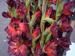 Роскошный гладиолус с крупными цветками красного цвета с шоколадным оттенком. Края лепестков более темные, по центру лепестка тонкая белая полоска.