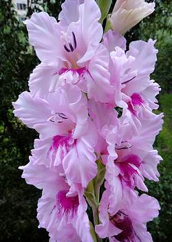 Гладиолус Джин. Нежно-лавандово-сиреневый с крупным растушёванным по краям малиново-сиреневым пятном на нижних лепестках. Цветки размером 11,5 см, гофрированные мелкими защипами по краям. В плотном прочном соцветии длиной 65 см одновременно открыто 8 цветков из 25. Высота 135 см. Срок цветения средний.