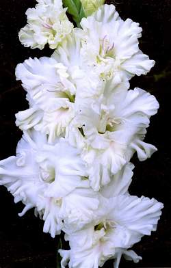 Гладиолус Фигурное Катание. Новый сорт селекции Владимира Фотина. Белоснежные цветки с изящной гофрировкой и размытым лимонным пятнышком на нижних лепестках. Размер цветков 14 см. Высота 150 см. Срок цветения средний.