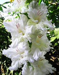 Гладиолус Франт. Цветки белоснежные, сильно гофрированные, с плотными лепестками. Размер цветков более 14 см. Цветонос высотой 150 см, соцветие очень мощное, с плотно уложенными цветками. В соцветии 22-23 бутона, одновременно открыты 8-9. Хорошая срезка. Срок цветения средний.