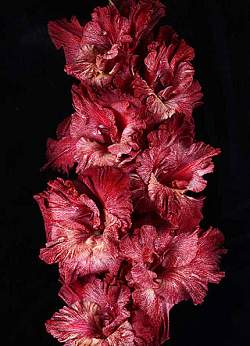 Гладиолус Гиперпространство. 597-СР-18, Фотин. Тёмно-красно-дымчатый. Лепестки испещрены тонкими светлыми полосками. Сильная гофрировка. Цветки размером более 14 см, сильно гофрированные. Срок цветения средне-ранний.
