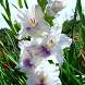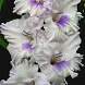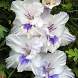 Гладиолус Голубая Бабочка. Очень светло-голубого, почти белого цвета гладиолус с синим пятном на нижних лепестках и голубыми тонами по краям лепестков. Чемпион выставок, один из лучших в своей группе окраски. Размер цветков более 14 см. В соцветии 22 бутона, одновременно открыто 10 цветков.