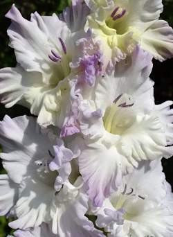Гладиолус Голубые Снежинки, 501. Эффектный колос с белоснежными складчато-гофрированными цветками, по краю лепестков широкая нежно-голубая кайма. Высота 140-150 см.
