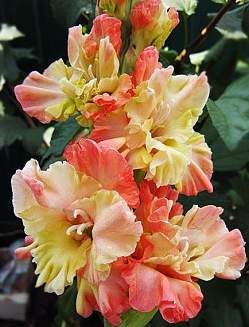 Гладиолус Графиня. Внешние лепестки розовые с белыми и бело-розовыми тонами. Внутренние лепестки молочно-розовые с желтовато-золотисто-зелеными переливами. Очень сильно гофрированный. Размер цветков 14 см. Лепестки толстые прочные, восковой фактуры. Количество бутонов — 22 (одновременно открыты 9). Срок цветения средне-ранний.